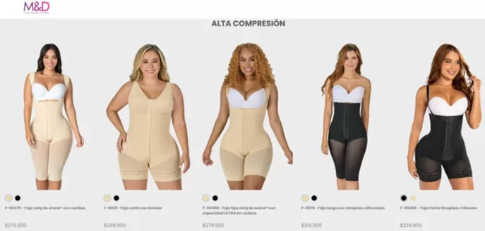 En el catálogo de Fajas M&D encontrará para mujeres, Fajas de Boyshort, Fajas Mid-thig, Fajas largas, Waistcincher, Bragas y Sujetadores; Para hombres, chaleco y faja masculina; Además, sus productos complementarios también forman parte de su cartera. También son de gran ayuda para los diferentes tratamientos y procedimientos estéticos.